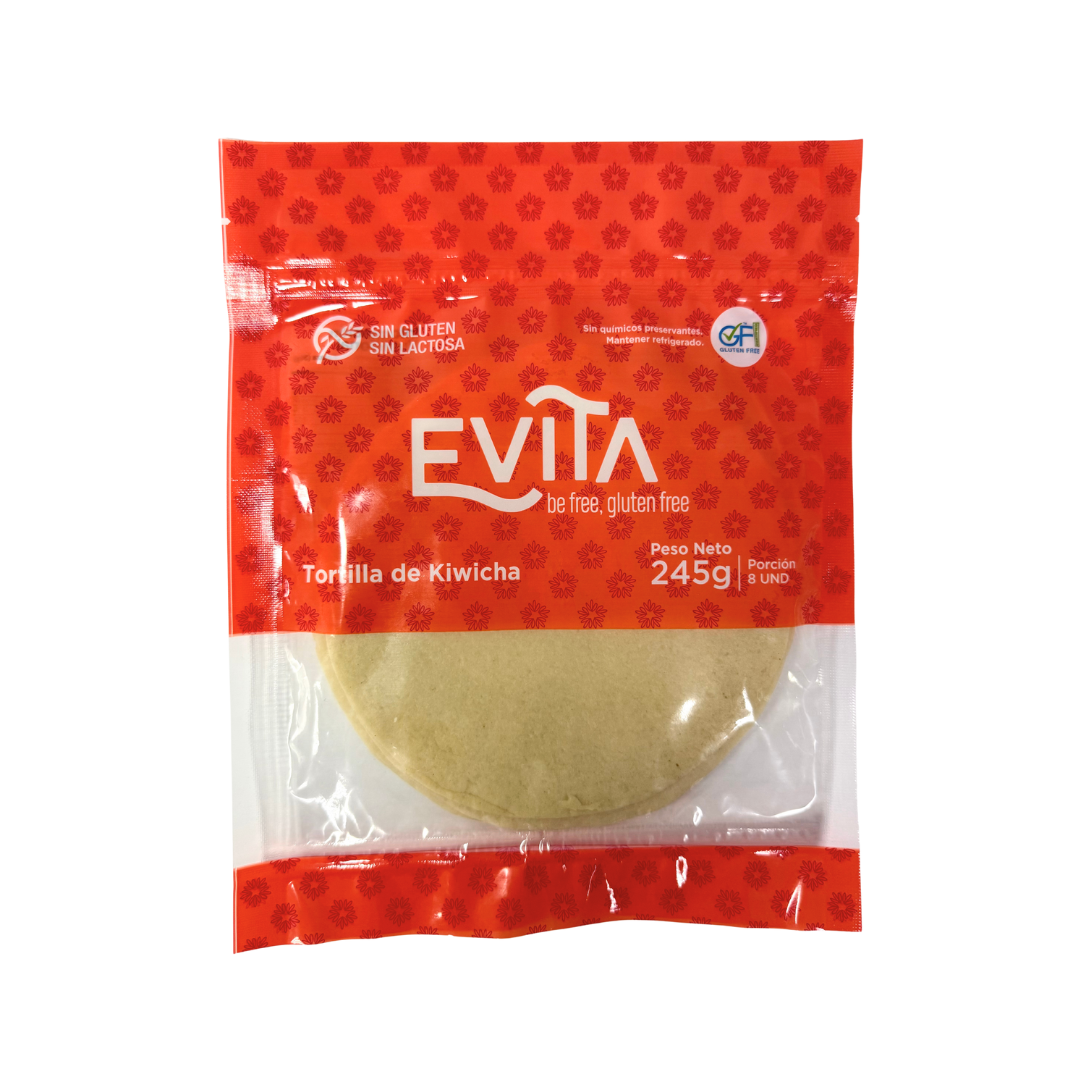 La Tortilla de Kiwicha de Evita es un producto alimenticio sin gluten ni lactosa, elaborado con harina de kiwicha (amaranto), harina de arroz, almidón de maíz, aceite de oliva, panela (azúcar de caña), sal y levadura, destinado al consumo de personas con restricciones alimentarias o que buscan alternativas saludables.